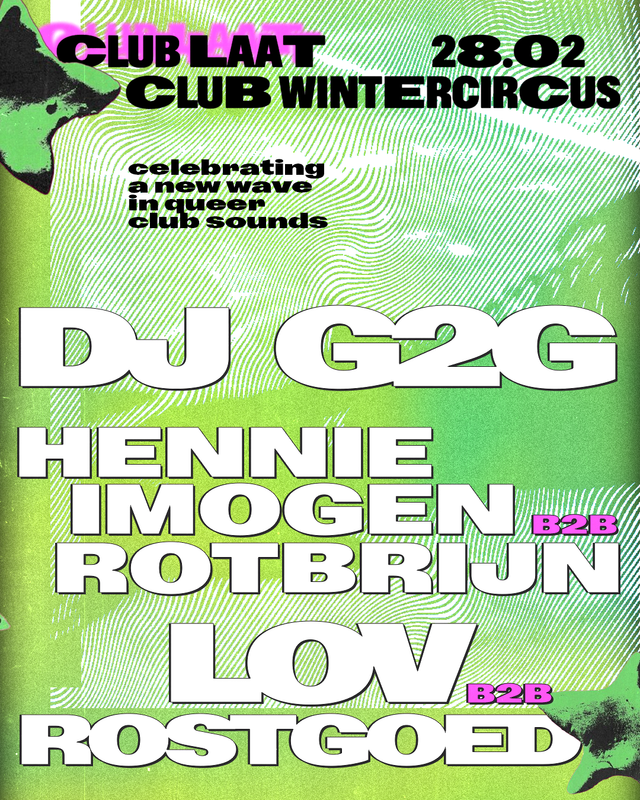 Club Laat is an event (series) at Club Wintercircus, and the name for a group of people who curate part of the Club's nightlife programme with a focus on young and local talent & diversity in order to create a place where many different people feel welcome.