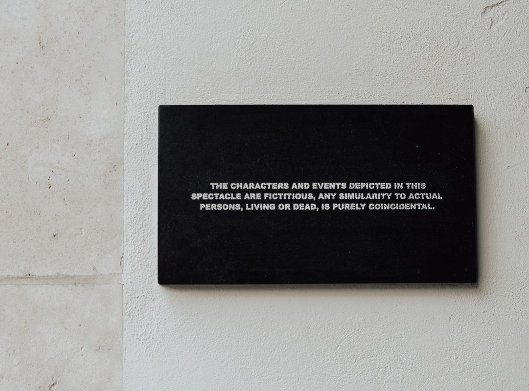 Huis’ werk ‘Disclaimer’ verwijst naar de aftiteling waarmee wordt geduid dat elke gelijkenis tussen echte feiten en wat er in de film te zien is, op toeval berust. Door de tekst in een marmeren plaat te graveren en in het openbare domein op te hangen, voegt Huis een extra dimensie toe aan wat er op straat gebeurt.